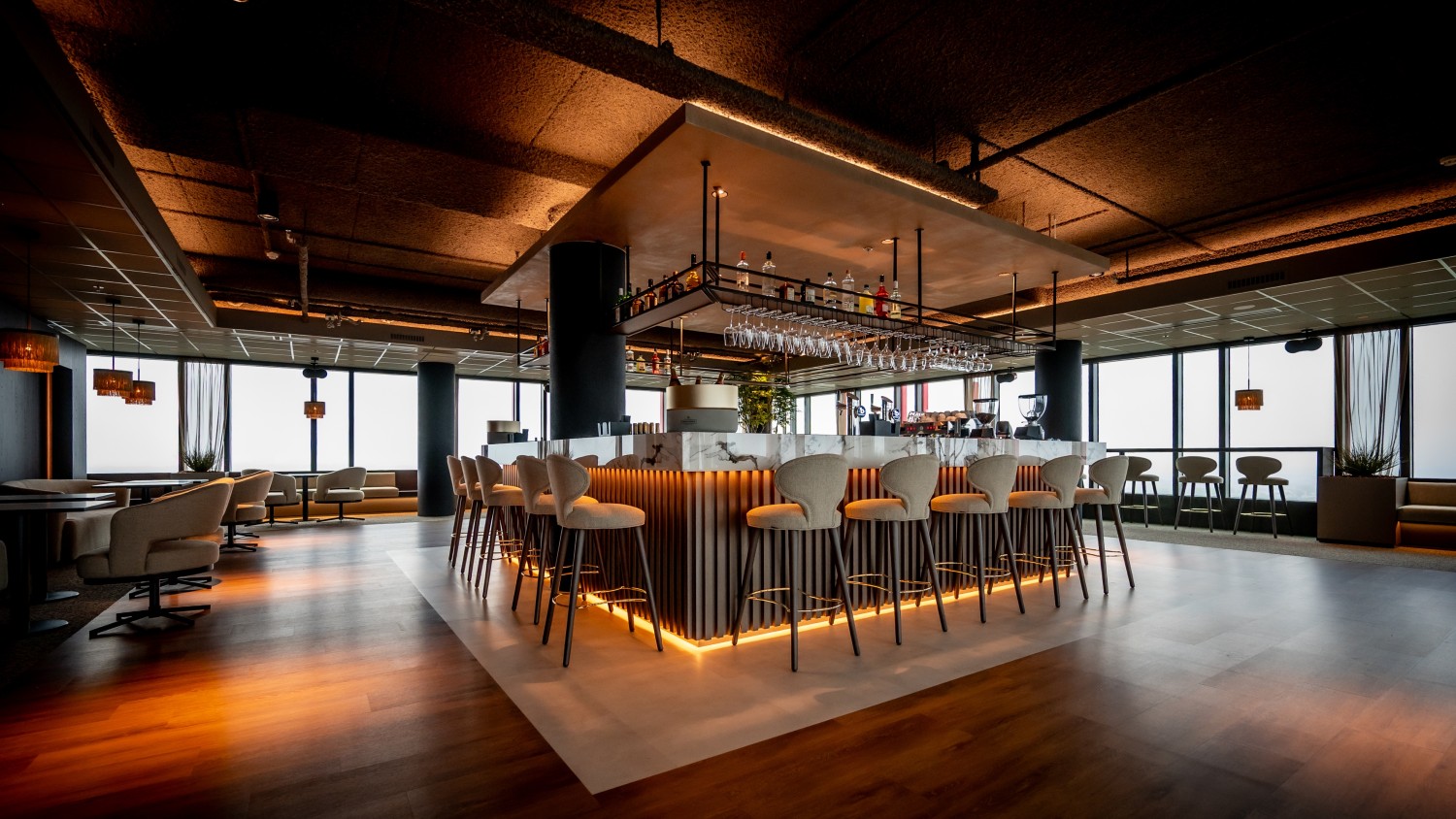 De 21e verdieping is volledig vernieuwd en biedt nu een high-end eventruimte in combinatie met een Skybar. Deze bijzondere locatie is ontworpen voor vergaderingen, productpresentaties, zakelijke borrels en netwerkbijeenkomsten.